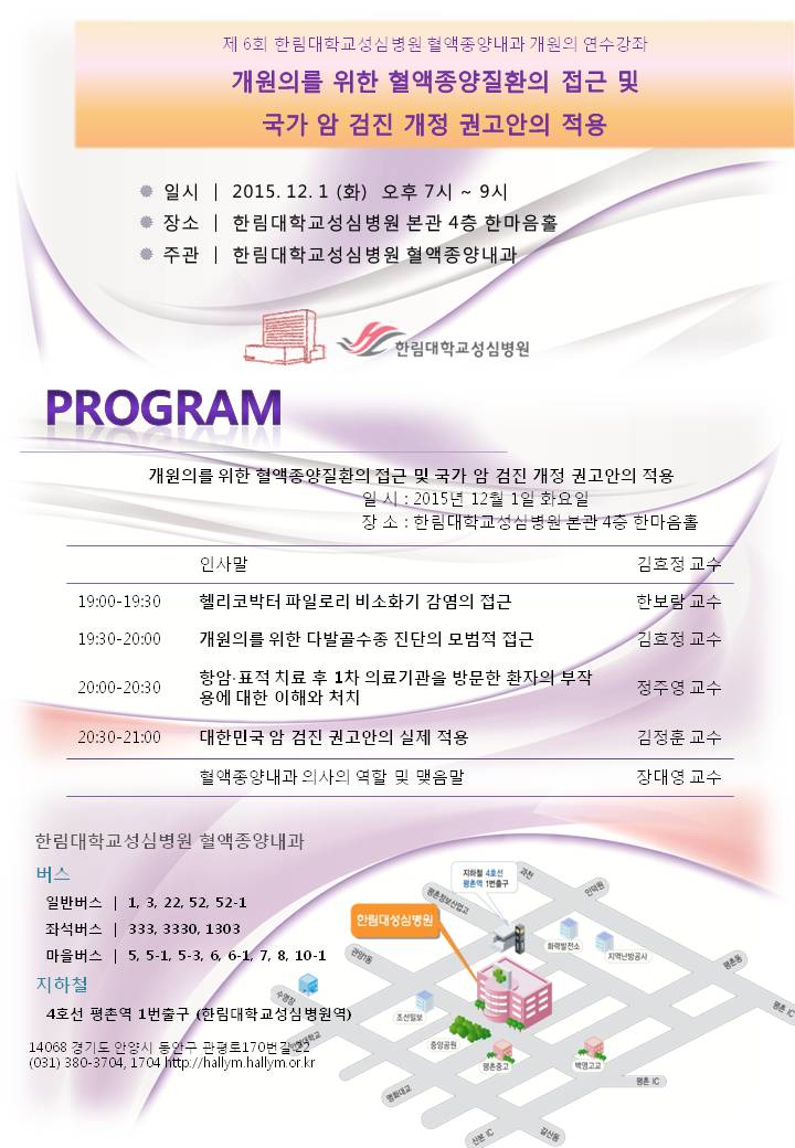이번 연수강좌는 ‘개원의를 위한 혈액종양질환의 접근 및 국가 암 검진 개정 권고안의 적용’이라는 주제로 △헬리코박터 파일로리 비소화기 감염의 접근(한림의대 한보람 교수) △개원의를 위한 다발골수종 진단의 모범적 접근(한림의대 김효정 교수) △항암․표적 치료 후 1차 의료기관을 방문한 환자의 부작용에 대한 이해와 처치(한림의대 정주영 교수) △대한민국 암 검진 권고안의 실제 적용(한림의대 김정훈 교수) 순으로 강의가 진행되며, 장대영 교수의 ‘혈액종양내과 의사의 역할 및 맺음말’로 마무리 된다.