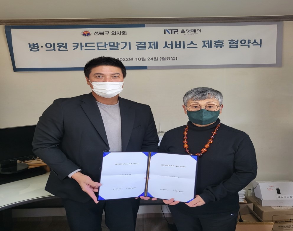 성북구의사회(회장 이향애)는 지난 10월 24일 ㈜올댓페이(대표 도준호)와 ‘병의원 카드단말기’ 서비스 제휴 협약을 체결했다.