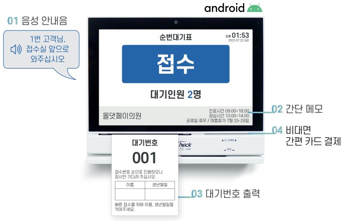 또 올댓페이는 최근 순번대기번호표 단말기를 새롭게 출시했다. 이 단말기를 이용하면 대기번호표를 접수증으로 활용할 수 있고, 비대면 간편 카드 결제도 가능해 수납 데스크의 혼란을 줄일 수 있다.