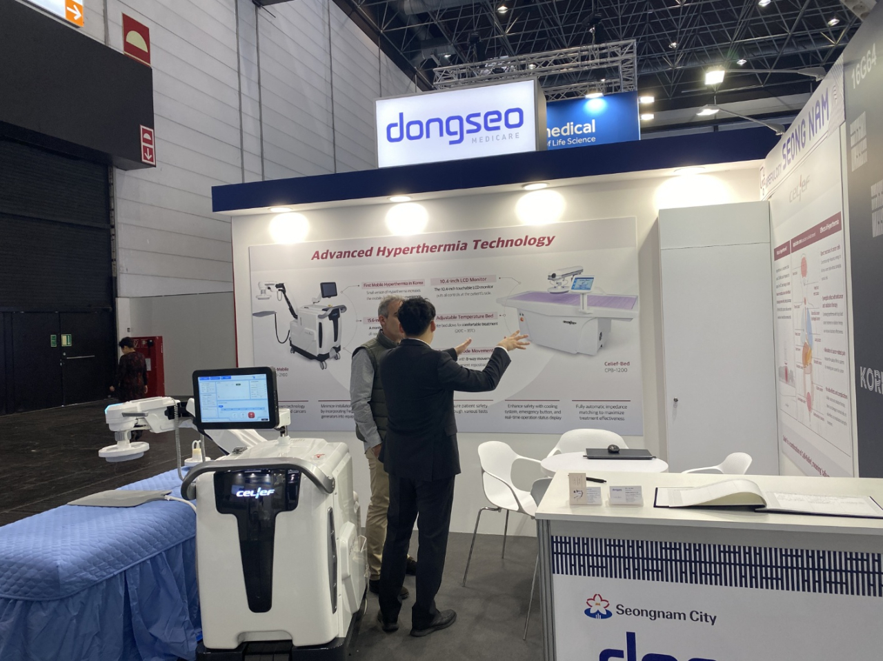동서메디케어(주)는 이번 전시회에서 국내 업계 최초로 개발한 모바일형 고주파 온열암치료기 ‘Celief CPB-2100’을 전시하고, 바이어 미팅을 진행했다. 성능과 디자인면에서 호평을 받으면서 해외 30여개 국가 바이어들이 몰려 국제적인 관심과 호응을 받았다는 후문이다.