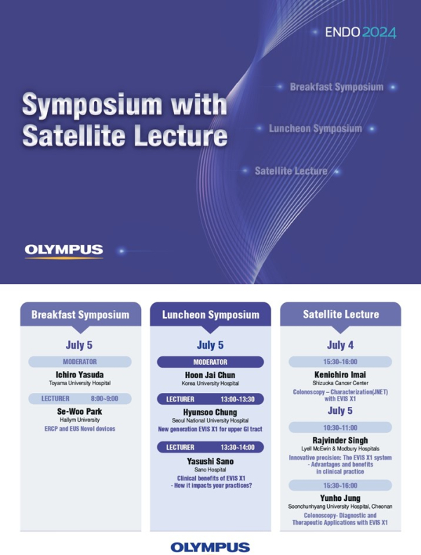 5일 런천 심포지엄에서는 ENDO 2024의 공동 회장을 맡은 고려대안암병원 전훈재 교수가 좌장을 맡고, 서울대병원 정현수 교수가 ‘상부 위장관 내시경의 새로운 패러다임, 이비스 엑스원’이라는 주제로 강연을 진행한다. 일본 사노병원 사노 야스시 교수는 ‘이비스 엑스원’과 EDOF 스코프의 임상적 혜택을 주제로 강연해 올림푸스 제품 관련 최신 치료 지견이 논의될 예정이다. 같은 날 조찬 심포지엄에서는 토야마대학부속병원 야스다 이치로 교수가 좌장을 맡고 한림대동탄성심병원 박세우 교수가 ‘새로운 ERCP 및 EUS 처치구’를 주제로 강연을 진행한다.