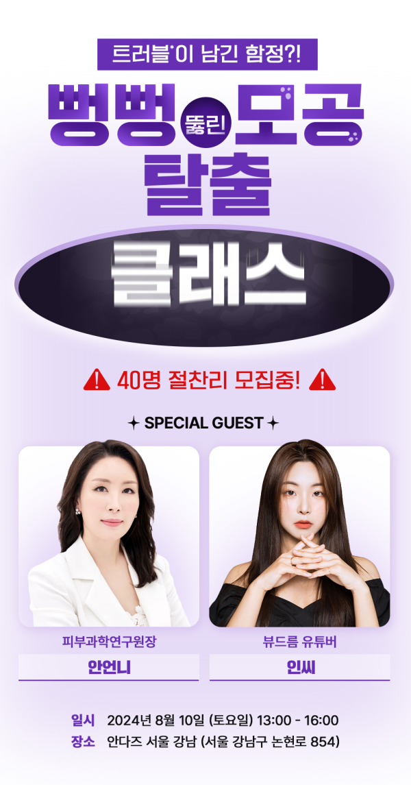 안언니는 ‘트러블&모공의 모든 것 Q&A’라는 주제로 트러블과 모공에 관한 전문적인 정보를 전달하고 평소 참가자들이 궁금했던 질문에 답하는 시간을 가질 예정이며, 인씨는 ‘인씨의 트러블&모공 케어 꿀팁 전수’ 주제로 일상에서 생기는 트러블과 모공 관리법, 모공 커버 메이크업 노하우 등을 전수할 예정이다.
