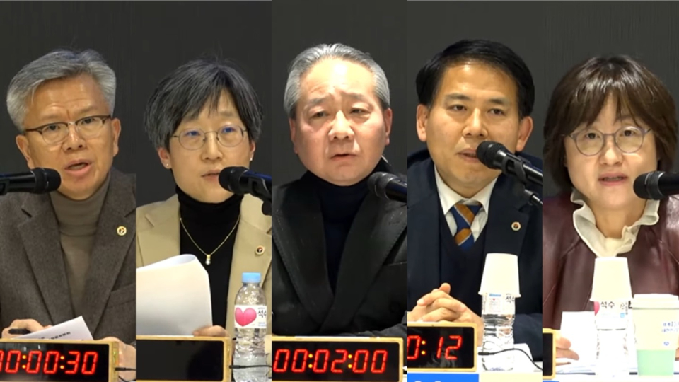 이에 대해 김택우·강희경·주수호 후보는 ‘X’를, 이동욱·최안나 후보는 ‘O’를 선택하며 의견이 나눴다.