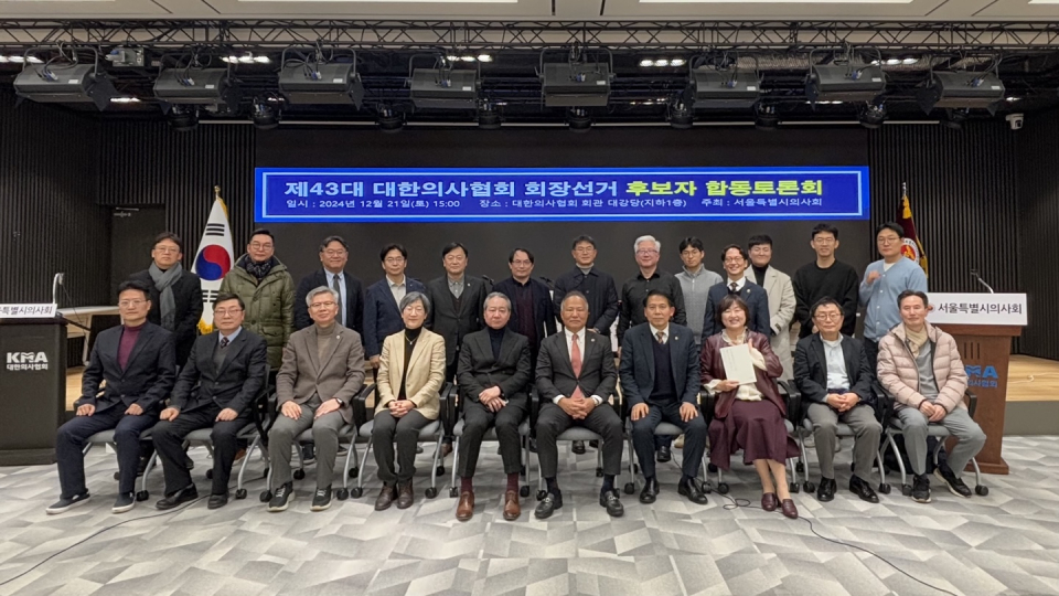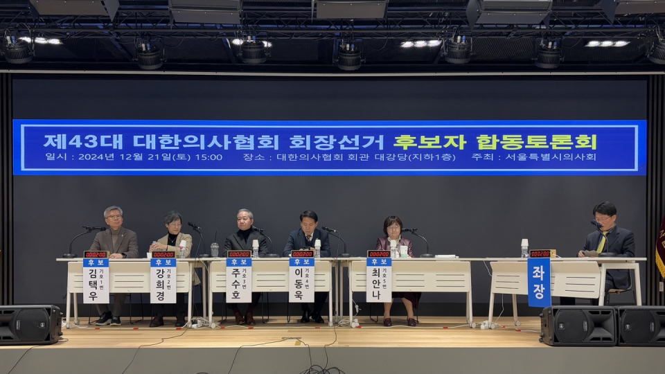 서울시의사회가 제43대 대한의사협회장 선거를 앞두고 합동토론회를 개최해 의료대란 사태와 의료정책 등 현안에 대한 후보자들의 생각과 향후 대응 방안을 물었다.