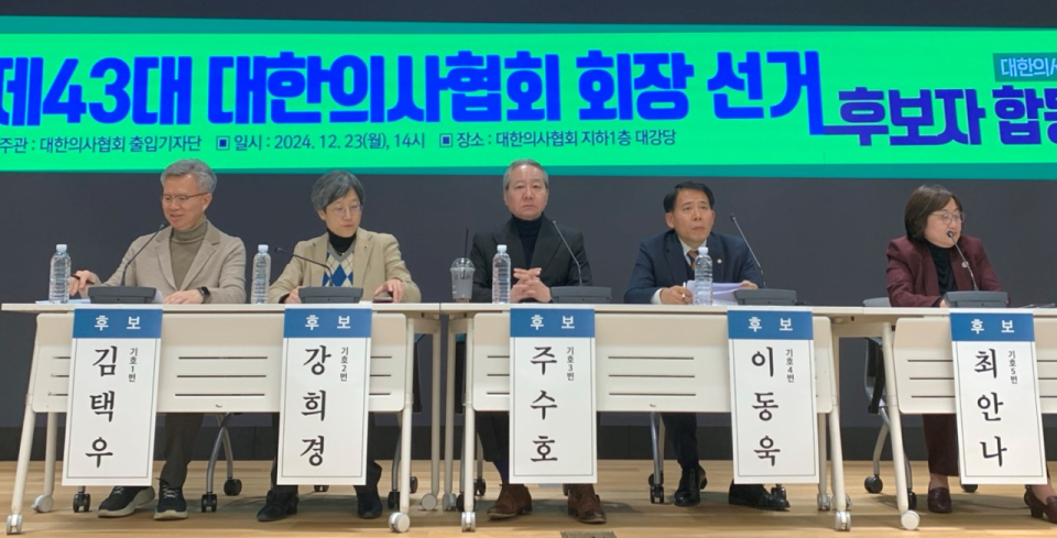 이에 현재 진행되고 있는 제43대 대한의사협회 회장 보궐선거에는 김택우(기호 1번, 전국광역시도의사회장협의회 회장), 강희경(기호 2번, 서울의대 소아청소년과 교수), 주수호(기호 3번, 미래의료포럼 대표), 이동욱(기호 4번, 경기도의사회장), 최안나(기호 5번, 대한의사협회 기획이사 겸 대변인) 후보가 출마해 각자의 공약과 비전을 제시하며 회원들의 선택을 기다리고 있다.