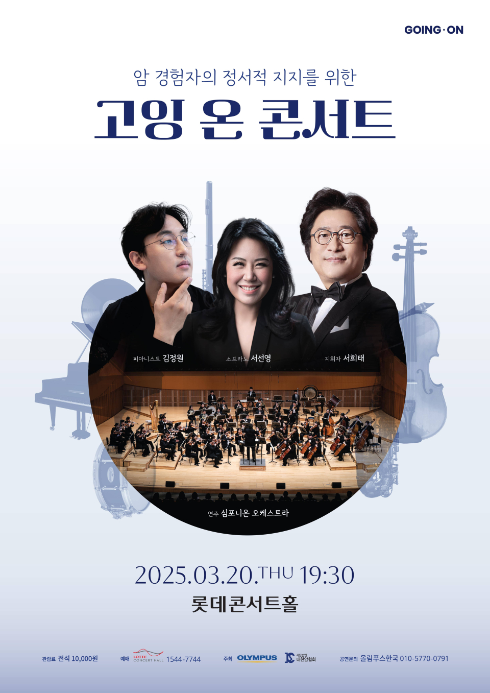 이번 공연으로 12회를 맞은 ‘고잉 온 콘서트’는 암 경험자 및 그 가족과 소통하고 이들을 응원하기 위해 마련된 맞춤형 음악회다. 암 경험자에 대한 정서적 지지와 사회적 공감대 형성을 위한 올림푸스한국의 사회공헌활동인 ‘고잉 온(Going-on) 캠페인’의 일환으로 기획됐다. ‘고잉 온’은 암 발병 후에도 암 경험자들의 아름다운 삶은 ‘계속된다’라는 의미를 담고 있다.