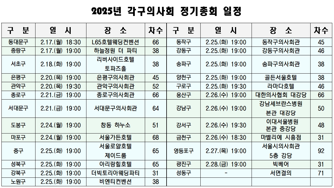 동대문구의사회는 2월17일(월) 오후 6시30분 L65호텔웨딩컨벤션에서 정기총회를 개최하며, 같은 날 중랑구의사회는 오후 7시 하늘정원 더 파티에서 열린다. 서초구의사회는 2월18일(화) 오후 7시 리버사이드호텔 토파즈홀에서 개최된다. 은평구의사회와 관악구의사회는 2월20일(목) 오후 7시30분에 각각 은평구의사회관과 관악구의사회관에서 총회를 연다. 종로구와 서대문구의사회는 2월21일(금) 오후 7시에 종로구의사회관과 서대문구의사회관에서 진행한다.