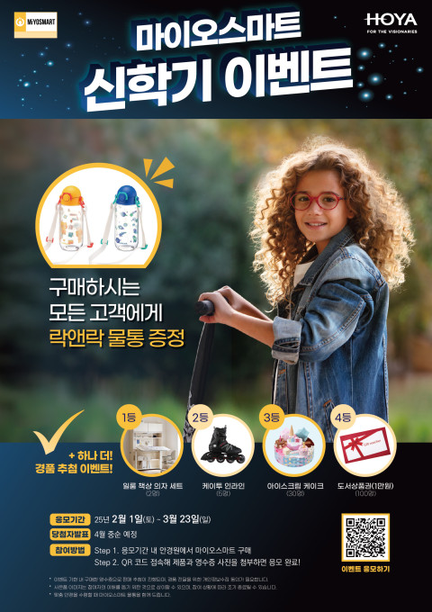 뿐만 아니라 한국호야렌즈는 마이오스마트 안경원의 소비자 방문을 촉진하고자 신학기 소비자 프로모션도 함께 진행한다. 마이오스마트를 구매한 모든 고객에게는 마이오스마트 락앤락 물통을 증정하며, 구매 영수증 인증을 통해 경품 이벤트에 참여할 기회도 제공한다. 경품으로는 일룸 책상세트, K2 인라인스케이트, 아이스크림 케이크 쿠폰, 도서 상품권 등을 준비해 소비자들에게 푸짐한 상품을 제공할 예정이다.