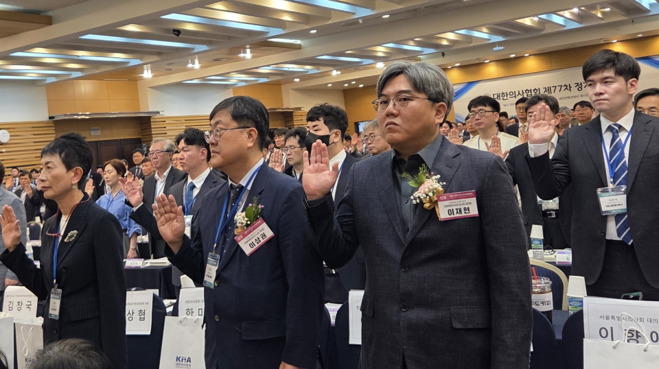 이날 정총에서 김교웅 대의원회 의장은 개회사를 통해 “지난 1년, 의료 농단이라는 파고에 의료계 현실은 비가역적인 상황으로 바뀌었다”고 진단하며 “정부의 권위주의적인 행정으로 의료 환경이 무너지고, 전공의와 의대생을 필두로 회원들의 미래에 어두운 그림자가 드리워졌다”고 우려했다.