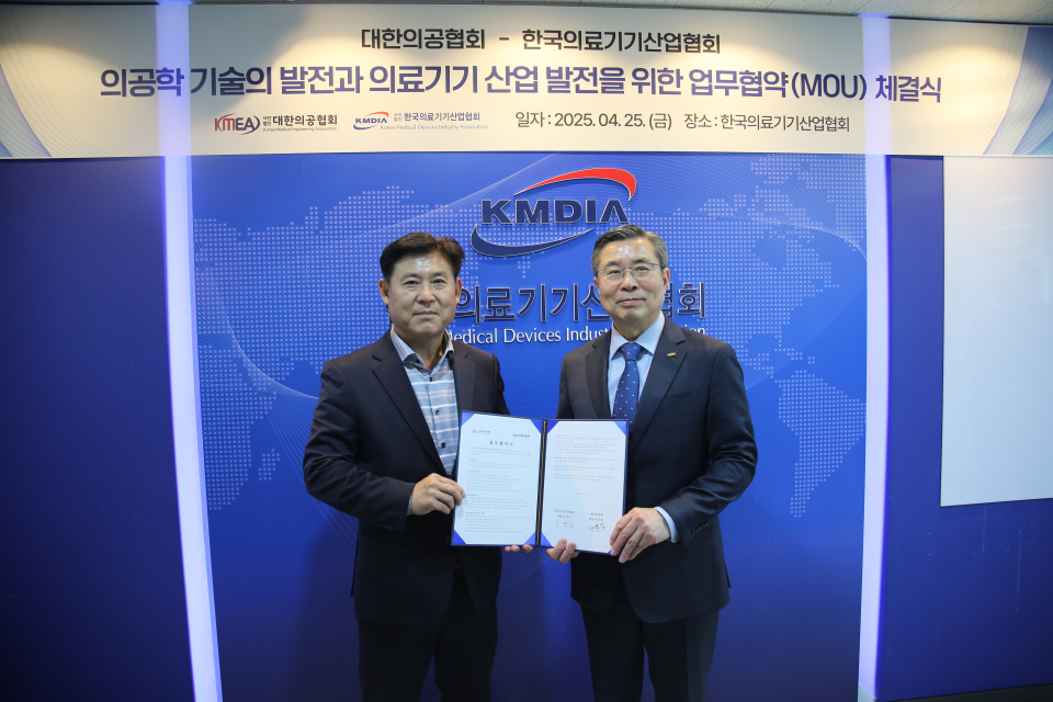 한국의료기기산업협회(회장 김영민)는 지난 25일 대한의공협회(회장 이동훈)와 함께 의공학 및 의료기기산업 발전을 위한 업무협약(MOU)을 체결했다고 29일 밝혔다.