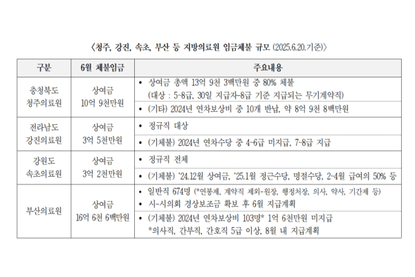 체불 규모가 가장 큰 부산의료원은 일반직 674명의 임금을 비롯해 지난해 연차보상비 대상인 103명의 1억600만원을 지급하지 않았다. 보건의료노조에 따르면 부산의료원은 체불임금을 시·시의회의 경상보조금을 확보해 6월 중 지급하고, 연차보상비는 오는 8월까지 지급할 계획이라고 밝힌 바 있다.