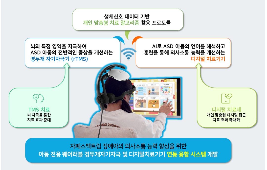 이번 과제의 핵심은 웨어러블 기기 기반의 경두개자극 기술과 중재 콘텐츠 기반의 디지털 치료 기기를 통합하는 것이다. 치료는 환자 개별 증상과 민감도에 맞춘 개인 맞춤형 설계를 바탕으로, 뇌 가소성을 유도해 의사소통 능력을 향상시키는 방식으로 진행된다.