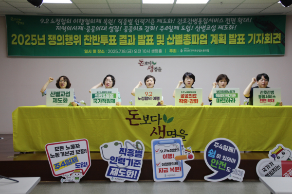 최희선 위원장은 “코로나 3년 6개월, 의정갈등 1년 6개월 동안 무너져가는 의료 현장을 지킨 이들은 보건의료노동자였다”며 “그러나 돌아온 것은 임금 체불과 인력 부족, 장시간 노동, 불법의료 강요뿐”이었다고 지적했다.