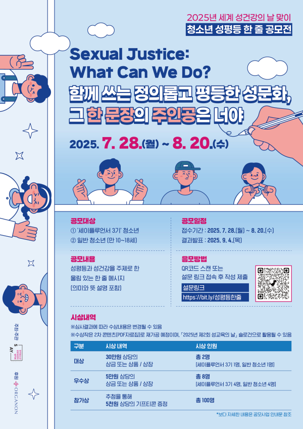 한국청소년성문화센터협의회(상임대표 이명화, 이하 한성협)와 한국오가논(대표 김소은)은 세계 성건강의 날을 맞아 7월28일부터 8월20일까지 약 한 달간 전국 청소년을 대상으로 성평등과 성건강을 주제로 한 줄 메시지를 공모하는 ‘2025 세계 성건강의 날 맞이 청소년 성평등 한 줄 공모전’을 개최한다고 밝혔다.