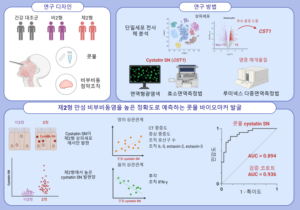 만성 비부비동염 환자를 대상으로 콧물과 비강 점막 조직을 확보한 후 단일세포 RNA 시퀀싱을 통해 제2형 염증 상피세포에서 발현이 증가한 CST1 유전자를 후보 물질로 도출했다. 제2형, 비2형, 건강군의 콧물 검체를 면역형광염색과 효소면역측정법을 통해 비교했더니, CST1 유전자가 만드는 시스타틴 SN(cystatin SN) 단백질 발현이 제2형 군에서만 뚜렷하게 높았다.