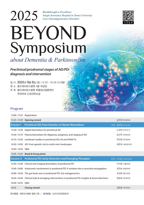 올해 심포지엄에서는 알츠하이머병과 파킨슨병의 전임상 및 전구기에 대한 최신 진단 기술과 조기 중재 전략을 주제로 강의와 토론을 진행할 예정이다.