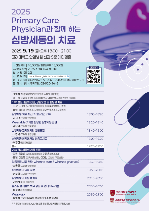 고려대학교 안암병원은 오는 9월19일(금) 오후 6시 부터 5층 메디힐홀에서 ‘2025 Primary Care Physician과 함께하는 심방세동의 치료’ 연수강좌를 개최한다.