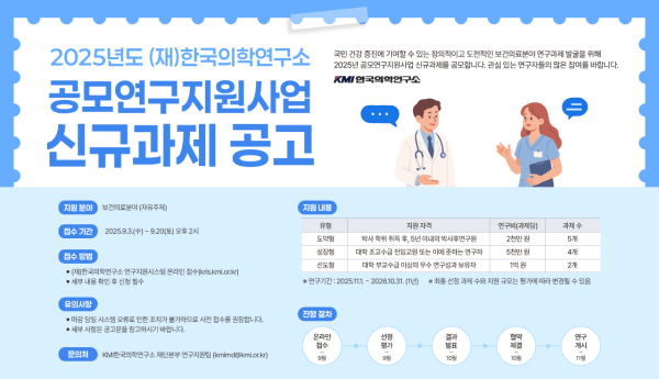 KMI한국의학연구소(이하 KMI)는 ‘2025년도 KMI 공모연구지원사업 신규과제 공모’에 참여할 연구자를 9월 20일까지 공개 모집한다.