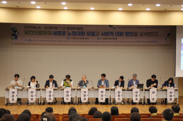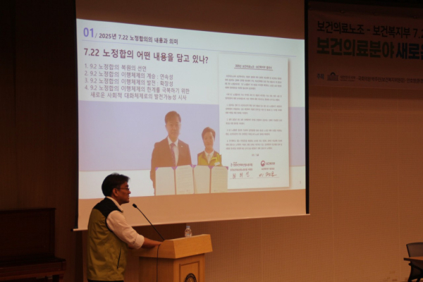 이어진 발표는 이문호 보건의료노조 정책자문위원장이 좌장을 맡아 박성국 한양대 경영학과 겸임교수와 정재수 보건의료노조 기획실장의 토론을 진행했다. 양 측의 발제문은 각 △9.2 코로나 사회적 합의-7·22 합의가 한국 사회적 대화에 주는 시사점 △이재명 정부에서 7·22 합의의 의미와 새로운 사회적 대화 모델 제안이다.