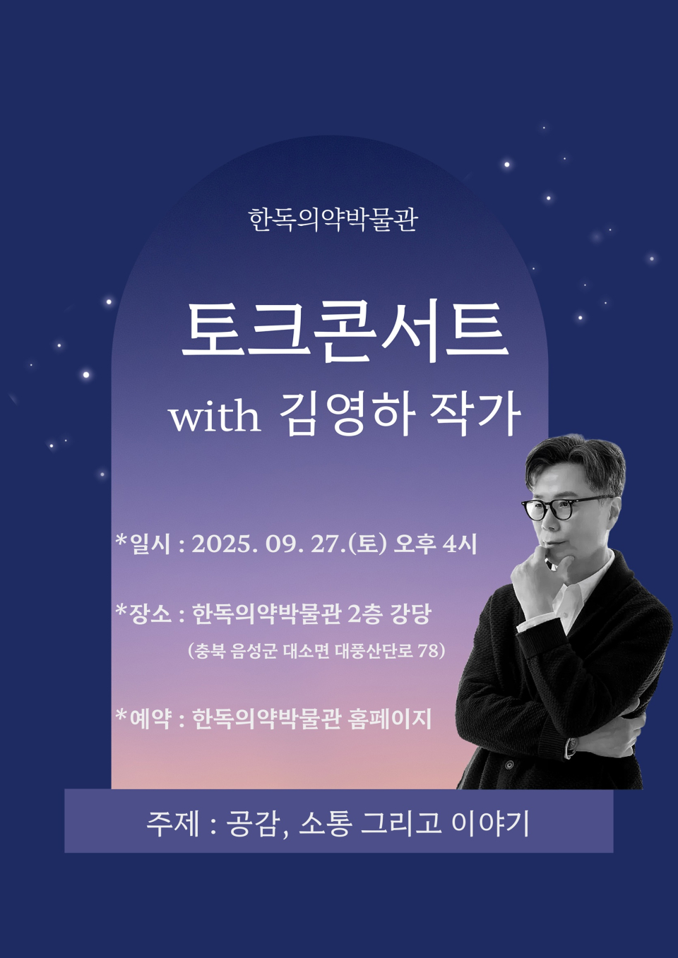 충북 음성의 한독의약박물관이 오는 27일(토) 오후 4시, 한국 문단을 대표하는 김영하 작가와 함께하는 토크콘서트를 개최한다.