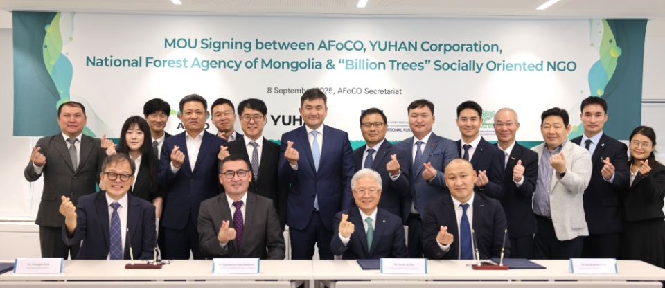 업무협약식은 지난 8일 오전 10시 서울 여의도 소재 AFoCO 사무국에서 개최됐으며, 조욱제 유한양행 사장, 박종호 AFoCO 사무총장, 오윤사나 몽골 산림청장, 볼드바타르 Billion Trees 대표, 수흐볼드 주한 몽골대사, 문흐바트 몽골 대통령실 비상임 고문 등 주요 인사가 참석해 국제적 협력의 의지를 확인했다.