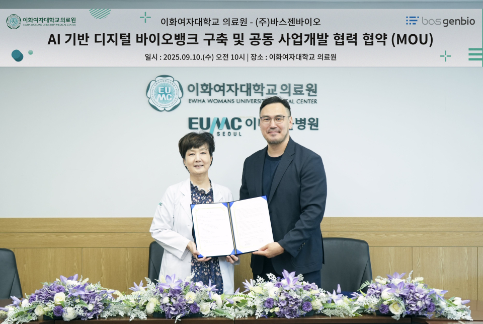 이화의료원(의료원장 유경하)이 바스젠바이오(대표 김호)와 지난 10일 이대서울병원 7층 부속회의실에서 ‘AI 기반 디지털 바이오뱅크 구축’을 골자로 업무협약을 체결했다고 15일 밝혔다.