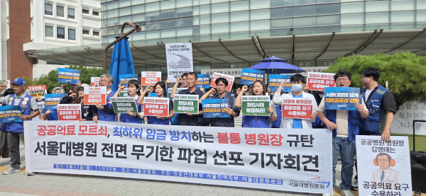 민주노총 공공운수노조 의료연대본부(본부장 박경득)은 22일 서울 종로구 서울대병원 본관 앞에서 오는 24일(수) 예정된 무기한 전면파업을 선고하는 기자회견을 열어 국립대병원 국가책임제를 강조했다.