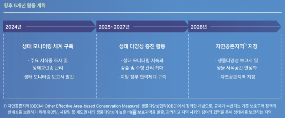 유한양행은 5개년 계획을 통해 2027년까지 모니터링과 서식지 관리 범위를 확대하고, 지자체와의 유기적 협력을 통해 2028년에는 미호강 일대를 “자연공존지역”으로 지정하는 것을 목표로 하고 있다.