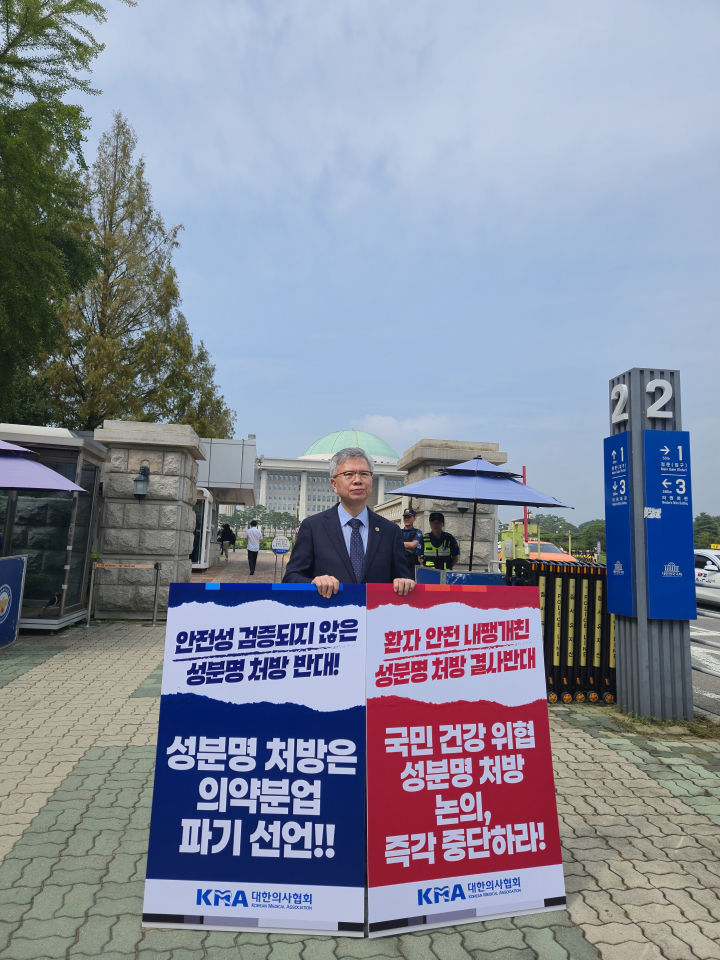 이날 1인 시위에 나선 김택우 회장은 “저희 대한의사협회는 어떠한 이유라도 성분명 처방은 절대 좌시할 수 없다”며 “이것은 국민 건강권을 지키기 위한 최후의 도리”라고 강조했다.