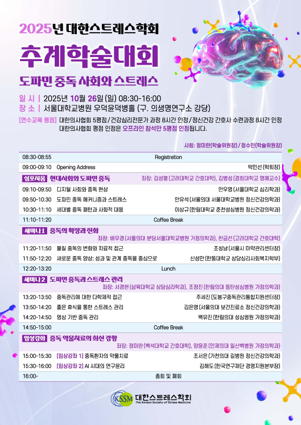 대한스트레스학회(회장 박민선 서울의대 교수)는 오는 10월26일(일) 서울대병원 우덕 윤덕병홀에서 ‘도파민 중독 사회와 스트레스’를 주제로 추계학술대회를 개최한다.