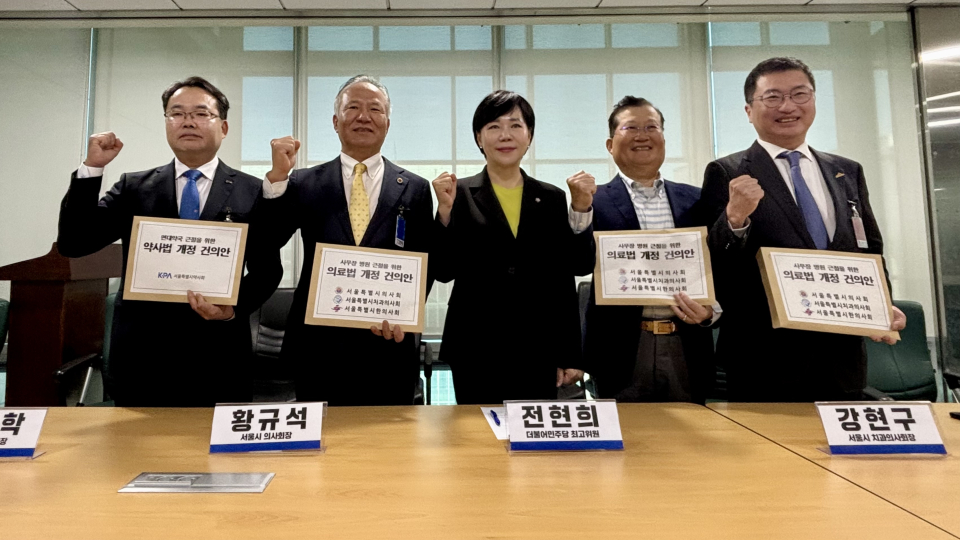 서울시의사회는 22일 오전 서울특별시치과의사회·서울특별시한의사회·서울특별시약사회와 함께 국회의원회관에서 전현희 의원(더불어민주당 수석최고위원)을 만나 간담회를 열고, ‘의료법·약사법 일부개정법률안 제안서’를 전달했다.