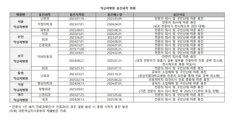 자료에 따르면 6곳의 적십자병원 중 올해도 4곳에서 일부 과목이 ‘전문의 퇴사 및 구인난’, ‘의료취약지 파견의사 진료 종료’에 따라 휴진했다.