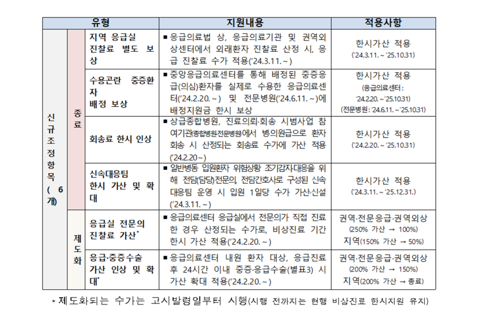 정부는 지난해 2월20일부터 의료기관의 중증·응급의료체계 유지와 진료 공백 최소화를 위해 건강보험에서 10가지 항목을 지원해 왔으며, 이 중 4개 항목은 그간 ‘25년 병·의원 상대가치점수 연계·조정, 상급종합병원 구조전환 시범사업(2024.10~)’ 및 ‘포괄 2차 종합병원 지원사업(2025.7.~)’ 추진 등과 연계해 조정한 바 있다.