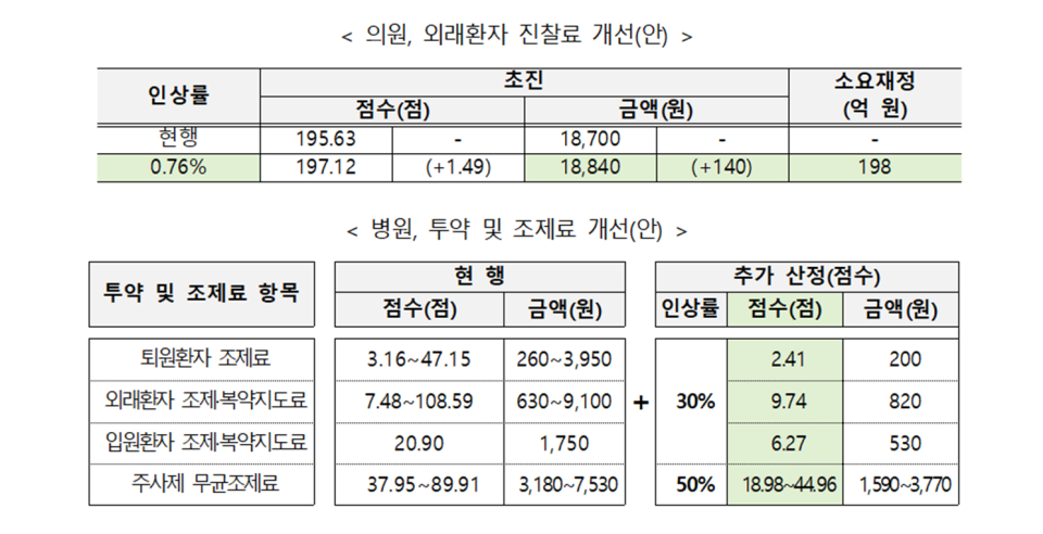 의원 초진 진찰료 0.76%, 병원 중증진료 관련 4개 항목 30~50% 인상